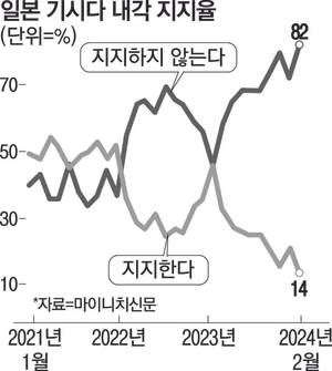 기시다 내각을 지지하지 않는다는 응답도 지난달보다 10% 포인트 상승한 82%나 됐다. 이 신문이 내각 지지율 조사를 시작한 1947년 7월 이후 최고치다.