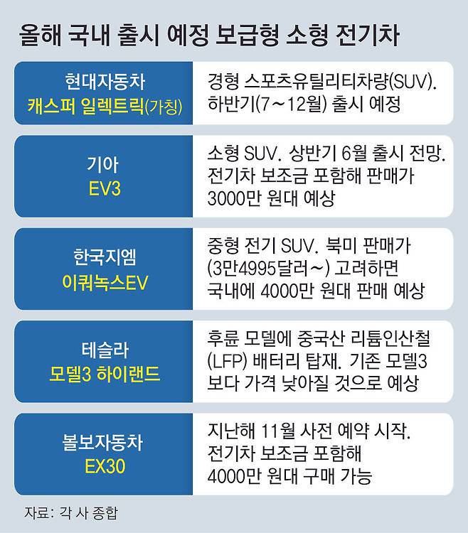 국내 전기차 시장도 이런 흐름이 이어지고 있다. 기아는 소형 전기차 모델인 ‘EV3’를 상반기(1∼6월)에 출시할 예정이다. 현대자동차그룹의 순수 전기차 플랫폼(E-GMP)에 기반한 첫 보급형 모델이다. 기아 측이 밝힌 예상 최저가가 3만5000달러(약 4674만 원)인 점을 고려하면 전기차 보조금까지 합해 3000만 원대에 구매가 가능할 것으로 예상된다.