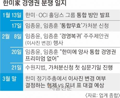 한미가에서는 OCI그룹과의 통합을 추진하는 모녀(송영숙·임주현)와 이를 반대하는 형제(임종윤·임종훈) 간 양보 없는 대립이 이어지고 있다. 앞서 이들 두 형제는 다음달 주총에서 이사진을 대거 교체해 통합 작업을 막겠다고 엄포도 놨다. 지난 8일 자신들을 포함한 6명을 한미사이언스 이사로 선임하는 안건을 주총에 상정해 달라고 제안한 상태다. 이어 21일 수원지법에서는 이들이 제기한 신주발행금지 가처분을 둘러싼 첫 심문기일이 열려 법정 공방도 벌인다.
