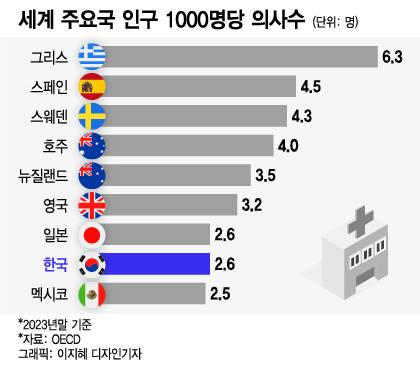 블룸버그는 OECD(경제협력개발기구) 보건통계를 인용해 2023년 기준 한국의 인구 1000명당 의사 수가 2.6명으로 주요국 중 최하위 수준이라는 점을 강조했다. 인구 1000명당 의사 수는 그리스가 6.3명으로 가장 많고 스페인(4.5명), 스웨덴(4.3명), 호주(4명), 뉴질랜드(3.5명), 영국(3.2명) 등 순이다.