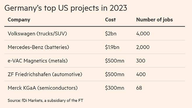 외국인직접투자(FDI)의 한 종류인 그린필드형 투자는 현지에 공장이나 사업장을 새로 짓는 방식으로, 고용 창출 효과가 크다. 독일 기업들의 미국 투자 붐은 2022년 하반기부터 시작됐다. 당시는 조 바이든 행정부가 인플레이션감축법(IRA), 반도체칩과 과학법(칩스법) 등을 제정해 청정 기술 제조업 분야와 반도체 산업에 총 7000억달러에 육박하는 세액 공제 및 보조금 등의 혜택을 제공하기로 한 원년이다. 독일 기업들이 지난해 미국에서 발표한 자본 프로젝트는 185개로, 이 중 73개가 제조업 부문에서 이루어졌다.