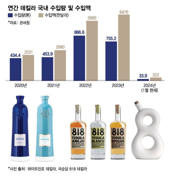 국내 주류 업계에서는 미국의 이 같은 데킬라 인기가 조만간 한국에서 시작될 것으로 내다보고 있다. 이미 데킬라 수입액이 빠르게 증가하고 있다. 관세청 수출입무역통계에 따르면 지난해 국내 데킬라(품목명:데낄라) 수입액은 2020년 253만1000달러(약 33억7888만원)에서 지난해 647만6000달러(약 86억5000만원)으로 4년 만에 1.6배 가량 늘었다.