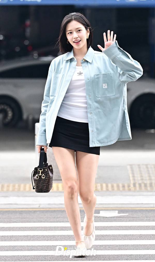 안유진은 블루 컬러의 재킷과 심플한 티셔츠, 짧은 미니스커트로 눈부신 미모를 뽐냈다. 완벽한 비율과 러블리한 비주얼이 시선을 사로 잡았다.