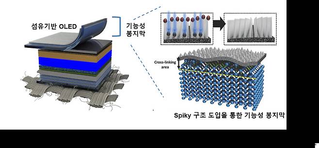 | ▲ 기능성 봉지막이 포함된 섬유기반 OLED 구조 Spiky 구조 기반으로 가스확산장벽, 광 추출, UV 차단, 세탁 신뢰성 등 다기능성 봉지막이 포함된 섬유기반 OLED의 구조. / 그림설명 및 그림제공: 가천대학교 전용민 교수 |