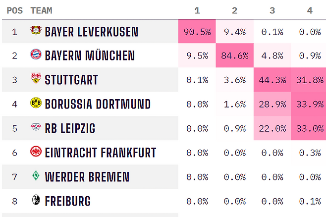 실제 분데스리가 순위표를 살펴보면 1위 레버쿠젠(승점 58)과 2위 뮌헨(승점 50)의 격차는 승점 8까지 벌어졌다. 물론 아직 양 팀 모두 12경기씩 남았다. 하지만 최근 분위기와 흐름 등을 놓고 봤을 때 레버쿠젠이 월등히 앞서는 만큼 레버쿠젠의 우승 확률이 압도적으로 높은 것으로 풀이된다.