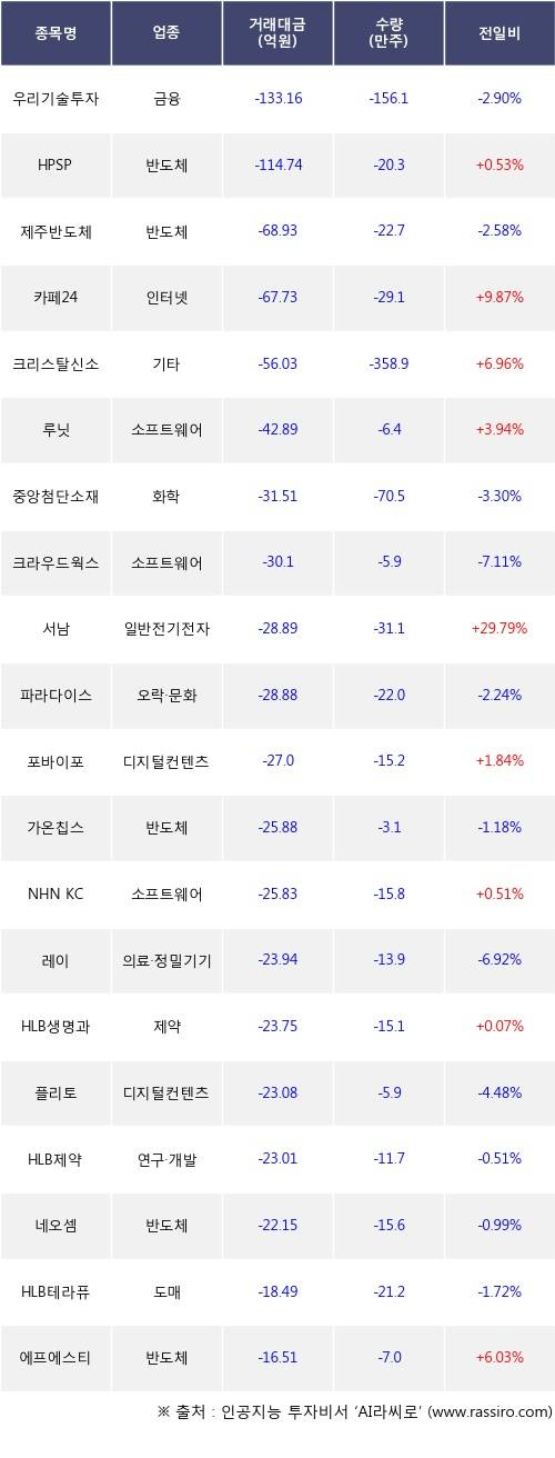 외국인 투자자의 순매도 상위 20개 종목은 우리기술투자, HPSP, 제주반도체, 카페24, 크리스탈신소재, 루닛, 중앙첨단소재, 크라우드웍스, 서남, 파라다이스등이다.