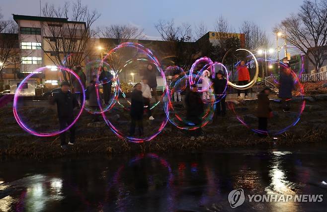 (서울=연합뉴스) 김성민 기자 = 정월대보름을 앞둔 20일 오후 서울 송파구 성내천 물빛광장에서 시민들이 쥐불놀이 체험을 하고 있다. 이번 쥐불놀이 행사는 실제 불 대신 LED 조명과 재활용 페트병을 이용해 전통 놀이를 친환경적이면서도 안전하게 재현했다. 2024.2.20
