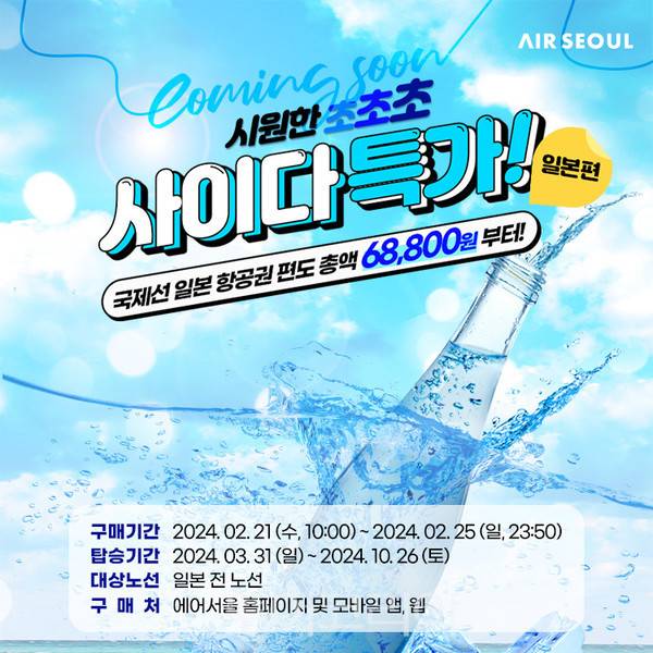'사이다 특가'는 에어서울 홈페이지 회원 한정 이벤트로, 조기 소진될 수 있다. 자세한 내용은 에어서울 홈페이지에서 확인할 수 있다.