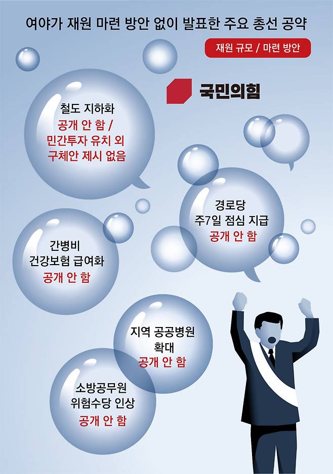 60대 이상 표심을 잡기 위해 내놓은 ‘간병비 건강보험 급여화’와 ‘경로당 주7일 점심’은 소요 예산 규모조차 밝히지 않았다. ‘철도 지하화’ 공약도 한동훈 비상대책위원장이 “민자 유치로 재원을 마련하겠다”고 밝혔을 뿐 재원이 얼마나 필요한지, 민자 유치를 어떻게 이끌어낼지에 대한 언급은 없었다. 한 위원장은 당시 재원이 불투명하다는 지적에 대해 “재원을 감안한 공약이고 우리는 실천할 것”이라고만 답했다. 이 외에도 5호 지역 공공병원 확대, 7호 노인 사회서비스형 일자리 확대 공약 등도 재원 규모와 마련 방안이 뒷받침되지 않았다.