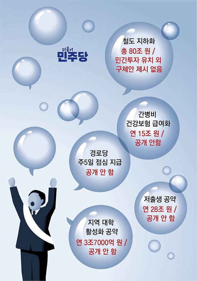 민주당 공약 중 가장 많은 예산이 소요될 것으로 예상되는 ‘도심 철도 지하화’ 공약에도 재원 대책은 빠져 있었다. 민주당은 경인선, 경부선 등 9개 철도 노선을 포함해 주요 도심 철도를 지하화하는 데 80조 원이 필요하다고 추정했지만 예산 확보안에 대해선 “민간투자 유치 외에 별도 검토한 바 없다”는 입장이다. 4호 공약인 저출산 대책에서도 자녀 수에 따라 빚을 탕감해 주는 데 연간 28조 원이 투입될 것이라고 밝혔지만 재원 마련안은 제시하지 않았다. 이재명 대표는 저출생 대책 발표 당시 “재원이야 앞으로 마련해 나가는 것이다. 시작이 중요하다”고 말하기도 했다.