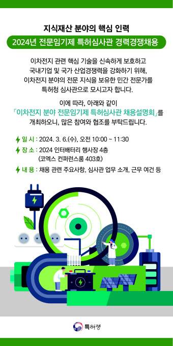 이차전지는 반도체와 함께 우리나라의 양대 안보·전략자산으로 우리 기업의 핵심 기술보호를 위한 특허출원이 급증하고 있는 반면 특허심사관 부족으로 심사 처리가 지연되고 있다. 이에 특허청은 지난해 하반기부터 이차전지 분야 심사관 증원을 위한 관계부처 협의에 착수해 같은해 11월 행안부와 38명 증원을, 올해 2월에 기재부와 예산협의까지 완료, 이번 채용을 진행하게 됐다.