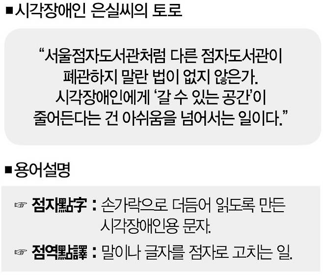 2023년 12월 31일, 서울점자도서관이 문을 닫았다. 1992년 1월에 개관했으니, 31년 만의 폐관이다. 서울점자도서관은 한국시각장애인연합회(이하 한시연)가 운영해온 민간기관으로, 시각장애인을 위한 독서공간이었다. 실물 점자책 700여권과 직접 제작한 전자도서, 녹음도서 등 음성책 1만5000여권을 제공했다. 서울점자도서관의 폐관으로 서울 소재 점자도서관은 9곳으로 줄어들었다.