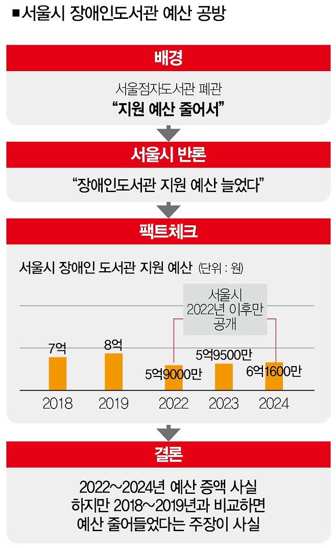 서울시는 강하게 반박했다. "서울시 장애인도서관 지원 예산은 2022년 5억9000만원, 2023년 5억9500만원, 2024년 6억1600만원으로 최근 3년간 꾸준히 증액했다(서울시 홈페이지 1월 3일)."