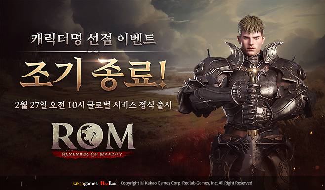 21일 레드랩게임즈는 카카오게임즈와 글로벌 동시 서비스를 준비 중인 '롬'의 캐릭터명 선점 이벤트를 조기 종료했다.