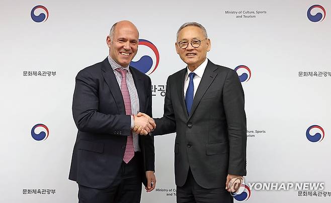(서울=연합뉴스) 유인촌 문화체육관광부 장관이 21일 서울 종로구 국립현대미술관 서울관에서 피터 컨(Peter Kern) 익스피디아그룹 부회장 겸 CEO와 면담을 마치고 악수를 하고 있다. 2024.2.21 [문화체육관광부 제공. 재판매 및 DB 금지]