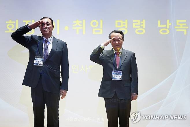 (서울=연합뉴스) 진연수 기자 = 21일 오후 서울 용산구 국방컨벤션에서 열린 대한민국예비역장교연합회(KOROA) 정기총회 및 법인 출범식에서 최용도 제4대 회장(왼쪽)과 이홍기 제5대 회장이 경례를 하고 있다. 2024.2.21