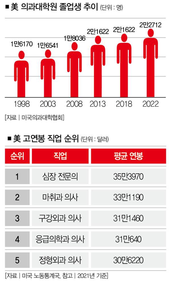 미국의 2021년 연봉 순위 1~18위는 모두 의사다. 미국 의사들은 전공의를 줄이고, 전문의를 늘리는 방식으로 고연봉을 유지했다. 2010년대 들어 의사보조(PA) 등 대체 직군이 늘어나자 미국 의사들은 전공의 수를 스스로 늘리기 시작했다. 한국 의사들이 인력 부족을 주장하면서도 의대 정원 증가에는 반대하는 속내를 알아봤다.