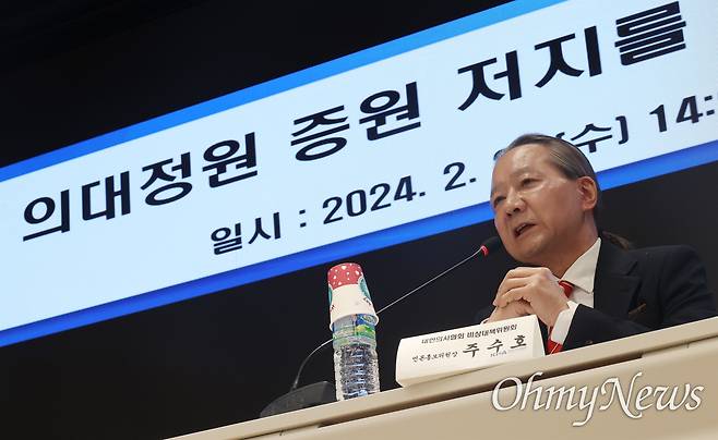 | ▲ 주수호 의대정원 증원 지지를 위한 대한의사협회 비상대책위원회 언론홍보위원장이 21일 오후 서울 용산구 대한의사협회 회관에서 정례 브리핑을 하고 있다. |