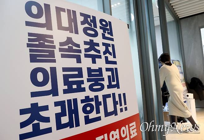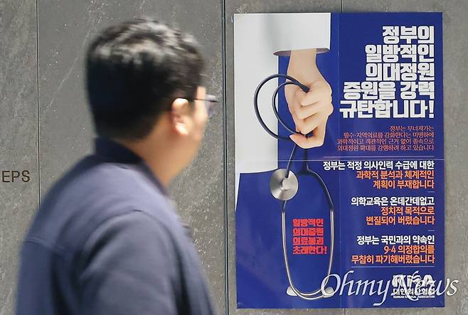| ▲ 정부가 의대정원을 2000명 늘리는 증원안을 발표한 가운데, 21일 오후 서울 용산구 대한의사협회 회관 로비에 정부의 일방적인 의대정원 증원을 규탄하는 포스터가 붙어 있다. |