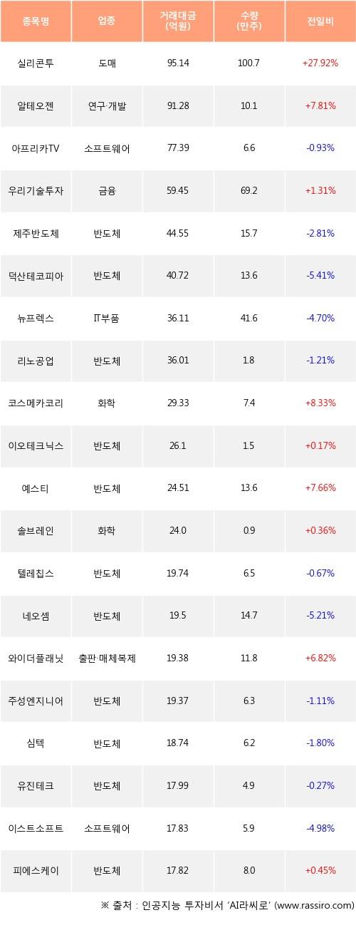 실리콘투, 알테오젠, 우리기술투자 등은 전일 대비 주가가 상승했고, 아프리카TV, 제주반도체, 덕산테코피아 등은 주가가 하락했다.