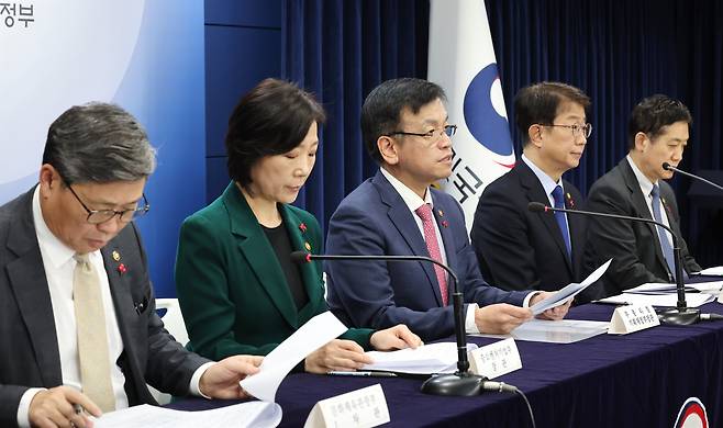 | ▲ 지난 1월 4일 최상목 경제부총리 겸 기획재정부 장관이 서울 종로구 정부서울청사에서 2024년 경제정책방향을 발표하고 있다. 왼쪽부터 전병극 문화체육관광부 1차관, 오영주 중소벤처기업부 장관, 최상목 경제부총리, 박상우 국토교통부 장관, 김주현 금융위원장. |