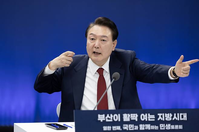 | ▲ 윤석열 대통령이 13일 부산시청에서 열린 '국민과 함께하는 민생토론회-열한 번째, 부산이 활짝 여는 지방시대'에서 마무리 발언을 하고 있다. |