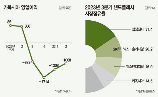 문제는 단기간 키옥시아 실적 반등을 기대하기 난망하다는 데 있다. 키옥시아는 2022년 3분기부터 흑자를 내지 못하고 있다. 2022년 4분기 1714억엔(약 1조5600억원) 영업적자를 기록했고, 지난해 1·2분기에도 대규모 손실을 냈다. 시장점유율도 하락세다. 시장조사기관 트렌드포스에 따르면 키옥시아는 지난해 3분기 점유율 14.5%로 낸드 3위 자리를 웨스턴디지털에 내줬다.