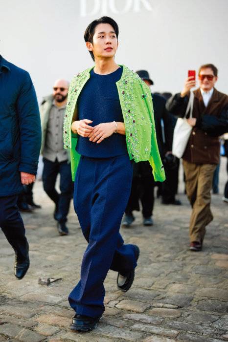 이보다 더 상큼할 수 없다. 디올옴므 2024 F/W 오트쿠튀르 쇼에 참석한 정해인은 네온 컬러 카디건에 슬리브리스 톱과 루스 핏 팬츠를 매치했다. 쿠튀르 감성의 고급 스팽글 장식이 더해진 카디건 덕분에 화사한 정해인의 외모가 더욱 귀족적으로 빛났다. 카디건은 디올옴므의 아티스틱 디렉터 킴 존스가 2024 S/S 레디투웨어 컬렉션에서 선보인 아이템이다. 당시 모델은 카디건에 호피 무늬 쇼트 팬츠를 착용해 정해인 룩과는 전혀 다른 분위기가 풍긴다.