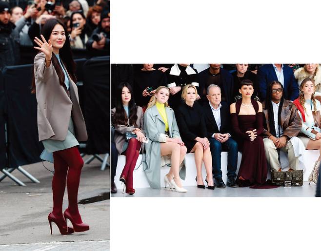 송혜교는 펜디 2024 S/S 컬렉션에서 뉴트럴 컬러 조합으로 극강의 우아함을 보여주었다. 그레이 테일러드 재킷에 라이트 블루 크루넥 스웨터, 하이웨이스트 쇼츠를 입고 버건디 컬러 타이츠와 같은 계열 플랫폼 힐을 매치한 것. 여기에 스웨터와 같은 컬러의 아이씨유 쁘띠 백을 들어 사랑스러움을 자아냈다. 리즈 위더스푼, 에바 필립, 젠데이아 등과 나란히 프런트 로에 앉아 쇼를 감상한 송혜교의 미모는 세계적인 미녀들 사이에서도 특히 돋보였다. 2021년부터 펜디의 글로벌 앰배서더로 활동 중인 송혜교는 쇼가 끝난 후 디올옴므와 더불어 펜디 여성복을 이끌고 있는 킴 존스와 다정 샷을 찍어 인스타그램에 올리기도 했다.