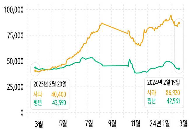 2024년 2월 19일의 사과 평균 가격은 무려 8만 6,920원. 평년의 사과 값이 4만 2,561원이니 평년 대비 104.2% 올랐습니다. 2023년 3월 27일에 평년 가격과 크로스를 한 이래로 계속 사과 값은 높은 가격대를 형성하고 있죠. 평년 대비 가장 가격이 많이 벌어진 때는 작년 11월 30일이었습니다. 당시 사과 가격은 8만 900원으로 평년(3만 9,334원) 대비 105.7% 더 비쌌어요. 한동안 격차가 2배까지는 넘지 않았던 사과 값이 2월 말에 들어서 다시금 2배 이상 벌어진 겁니다.