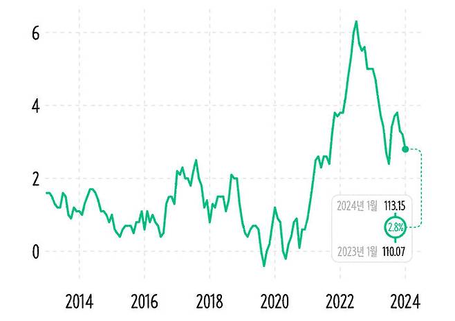 2024년 1월의 소비자물가지수는 113.15. 그런데 그래프의 모습이 조금 다르죠? 변수의 단위가 %이기도 하고, 표시된 수치도 더 작아요. 사실 소비자물가지수는 지수 그 자체만으로는 의미가 많지 않습니다. 앞서 이야기한 것처럼 특정 시점과 비교해서 지수를 해석해야 더 구체적으로 파악할 수 있거든요. 위 그래프는 작년의 같은 달의 소비자물가지수와 얼마나 차이가 나는지를 나타낸 겁니다. 작년 1월의 소비자물가지수가 110.07이었으니 이때와 비교해서 물가가 2.8% 늘었다고 할 수 있는 거지. 이 수치를 전년동월비라고 말해. 일반적으로 소비자물가지수의 등락률, 물가상승률이라고 하면 이 전년동월비를 의미합니다.