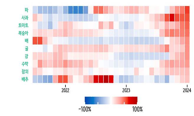 전년동월비 2.8%라는 수치에는 통계청이 조사한 458개의 상품과 서비스의 가격이 작년 1월과 비교해서 얼마나 오르고 낮아졌는지가 다 담겨 있습니다. 그렇다면 독자 여러분이 생각하기에 그중에서 가장 증가폭이 큰 품목은 뭐였을 것 같나요? 맞습니다. 우리가 피부로 느꼈던 농산품들이 상위권을 차지하고 있습니다. 파, 사과, 토마토, 복숭아, 배 등… 과일과 채소들 가격이 가장 많이 올랐어요. 아래 히트맵엔 작년 1월 대비 가장 가격이 많이 오른 10개 품목의 가격 변화를 나타내봤습니다. 빨간색이 진하면 가격 상승, 파란색이 진하면 가격 하락을 의미합니다.