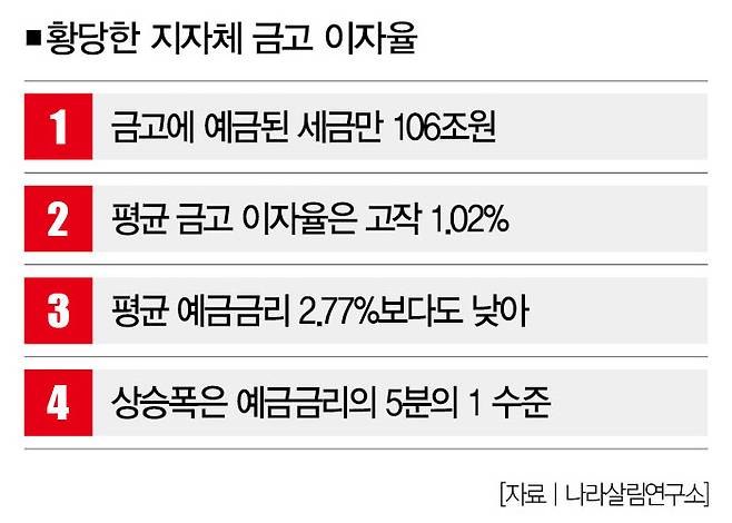 입출금이 수시로 이뤄지는 만큼 실제 금고에 쌓여 있는 자금은 이보다 적다. 지자체 금고의 월평균 잔액은 105조9442억원, 연말 기준 총 공공예금이자수입은 1조761억원이었다. 이를 통해 산출된 지자체들의 평균 금고 이자율 추정치는 1.02%였다.