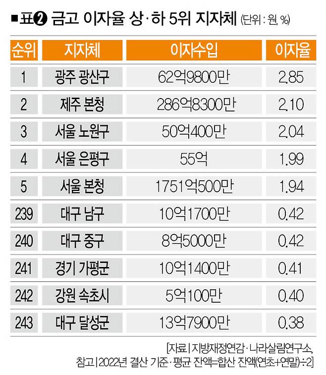 금고 이자율이 가장 낮은 지자체는 대구 달성군(0.38%)이었고, 강원 속초시(0.40%), 경기 가평군(0.41%), 대구 남구(0.42%), 대구 중구(0.42%)가 뒤를 이었다(표➋ 참조).