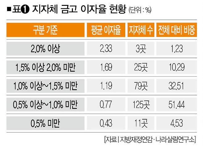 지자체의 금고 이자율을 좀 더 자세히 살펴보자. 243개 지자체 중 금고 이자율이 2.0% 이상인 곳은 3곳에 불과했다. 1.5% 이상~2.0% 미만인 곳이 25곳, 1.0% 이상~1.5% 미만이 79곳(32.5%)이었다. 대부분(125곳ㆍ51.4%)은 0.5% 이상~1.0% 미만이었다. 지자체 절반 이상이 1.0%도 채 안 되는 이자를, 10곳 중 8곳이 1.5% 미만의 이자를 받은 셈이다(표➊ 참조).