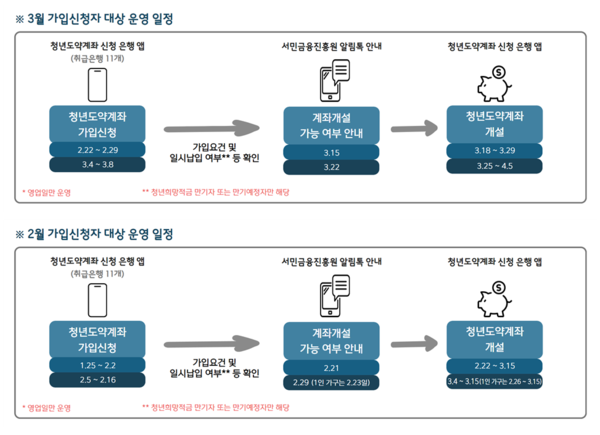 금융위 관계자는 “청년희망적금 만기를 고려해 3월 가입신청 일정은 22일에 조기 개시해 다음달 8일까지 운영한다”면서 “기존에 신청했지만 계좌를 개설하지 못했던 청년도 재신청이 가능하다”고 설명했습니다.