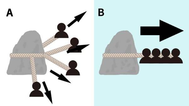 4명이 줄에 묶인 무거운 돌을 옮긴다고 생각해봅시다. 4명이 모두 일직선에 가까운 한 방향으로 움직여야지 돌을 옮길 수 있습니다. 만약 일부 인원이 조금이라도 다른 각도로 줄을 당긴다면 돌이 움직이는 속도는 현저히 낮아지겠죠.