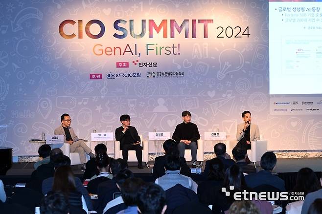 전자신문이 주최하고 한국CIO포럼, 공공부문발주자협의회가 후원하는 CIO Summit 2024가 'GenAI, First!'를 주제로 22일 서울 강남구 인터컨티넨탈서울코엑스에서 열렸다. 좌장을 맡은 이경상 카이스트 문술미래전략대학원 교수 주재로 패널 토론이 진행되고 있다. 왼쪽부터 이경상 교수, 엄열 과학기술정보통신부 인공지능기반정책관, 전병곤 생성AI스타트업협회(GAISA) 이사, 진요한 LG CNS AI센터 상무.