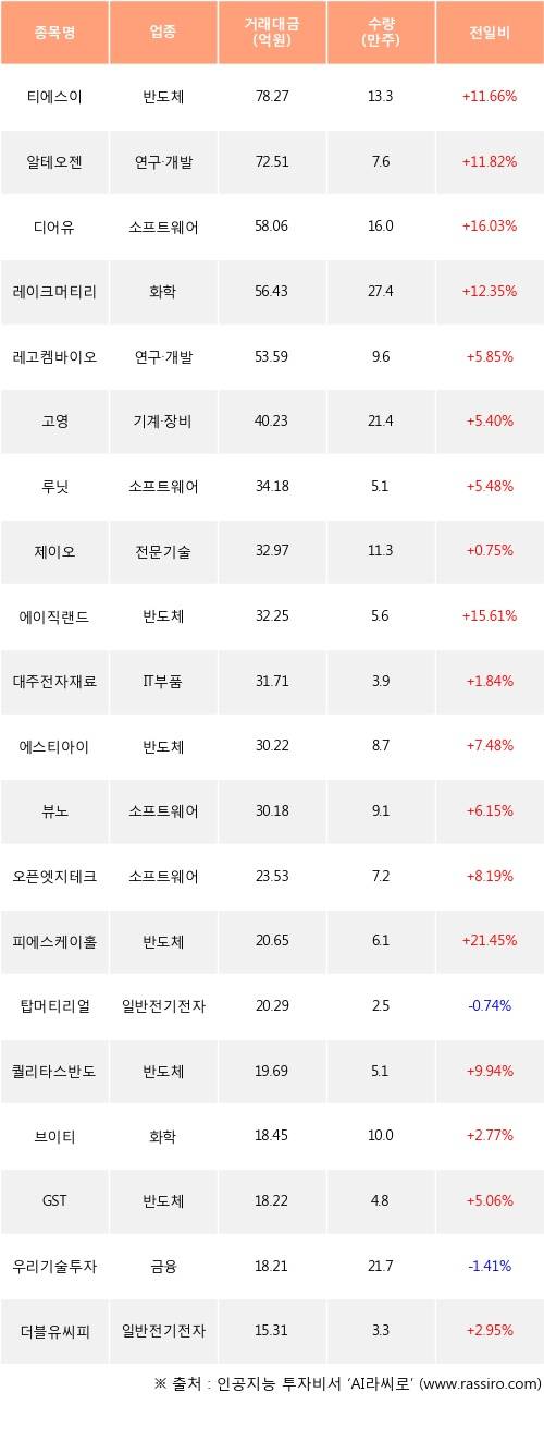 기관 투자자의 순매수 상위 20개 종목은 티에스이, 알테오젠, 디어유, 레이크머티리얼즈, 레고켐바이오, 고영, 루닛, 제이오, 에이직랜드, 대주전자재료등이다.