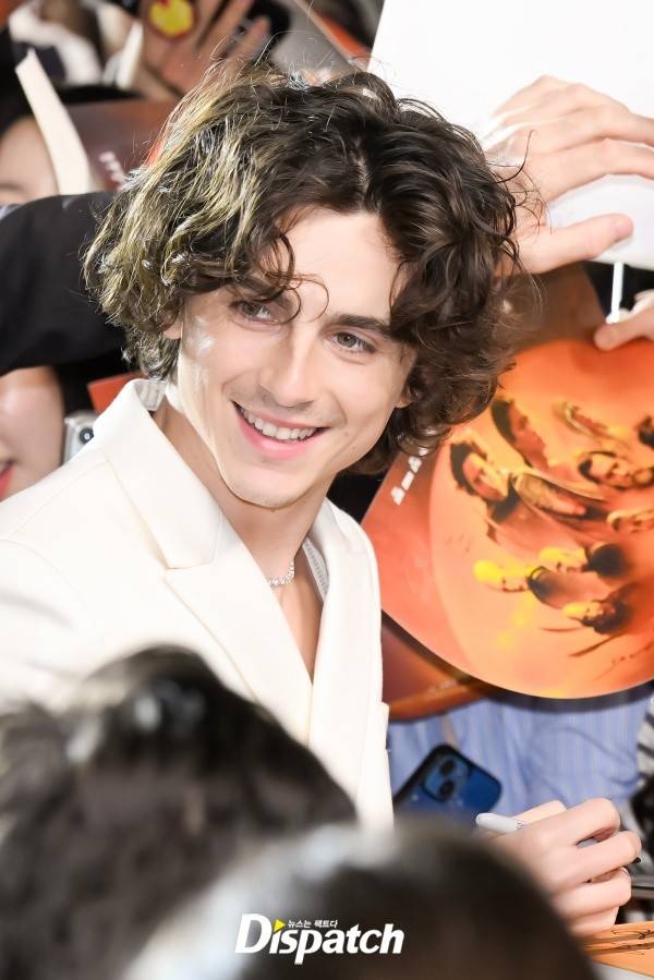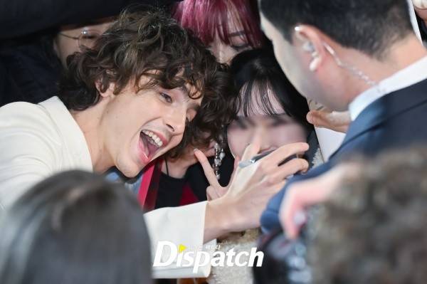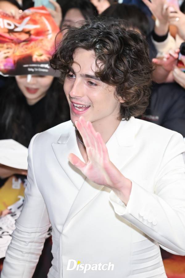 티모시 샬라메는 화이트 수트로 멋을 냈다. 팬들과 인사를 나누며 다정한 팬서비스를 펼쳤다.