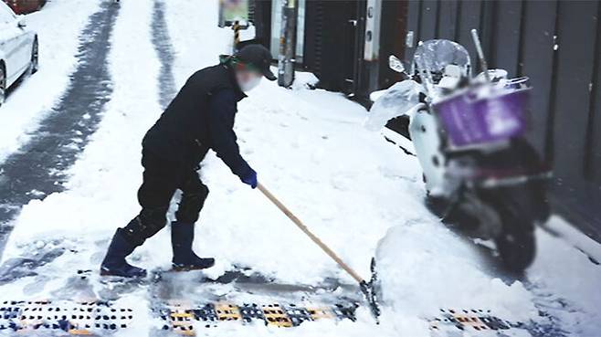 빙판으로 변한 길을 종종걸음으로 걷고, 손님이 미끄러지진 않을까, 상인들은 가게 앞 눈 치우는 데 여념이 없습니다.