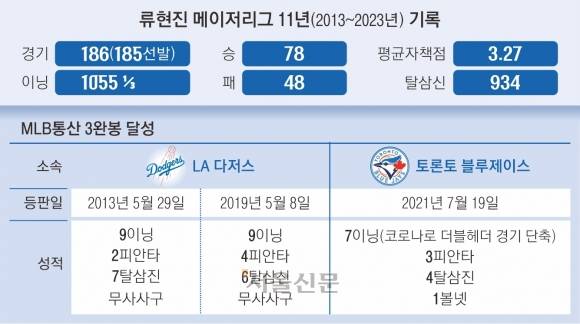한화에서 2012시즌을 마친 뒤 미국프로야구 메이저리그(MLB)에 진출했던 류현진은 11시즌 동안 빅리그 통산 186경기에 등판해 78승48패, 1세이브, 평균자책점 3.27, 934개의 탈삼진을 기록했다.