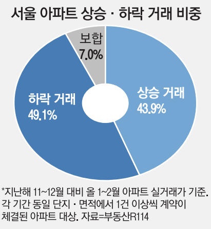 21일 부동산R114가 지난해 연말(11~12월)과 올해 연초(1~2월) 서울 아파트 실거래가를 비교한 결과, 연초 가격이 연말 가격보다 오른 ‘상승 거래’ 비중은 43.9%를 기록했다. 상승·하락 비교는 각 기간 동일 단지·면적에서 1건 이상씩 계약이 체결된 아파트를 대상으로 했다. 연초 서울에서 손바뀜된 아파트 10채 중 4채 이상이 작년 연말보다 더 높은 가격에 팔린 것이다. 하락 거래 비중은 49.1%, 보합은 7.0%로 나타났다.