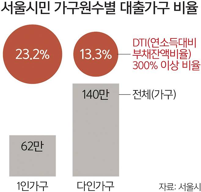 대출이 있는 1인가구는 62만가구로, 이 중 23.2%가 연 소득 대비 부채잔액비율(DTI)이 300% 이상인 ‘부채상환 위험’ 상태인 것으로 분석됐다. 다인가구는 대출이 있는 140만가구 중 13.3%가 부채상환 위험 단계였다. 1인가구의 부채상환 위험도가 더 높은 셈이다.