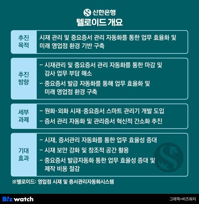 대 고객 서비스 뿐만 아니라 내부 업무 효율화를 위한 기술도 선보였다. '텔로이드'라고 명명된 이 서비스는 영업점의 시재와 중요 증서를 자동으로 관리해 주는 서비스다. 영업점 일선에서 일하는 직원들의 업무 효율을 끌어올림과 동시에 횡령 등 금융사고를 예방할 수 있는 기능까지 갖췄다.