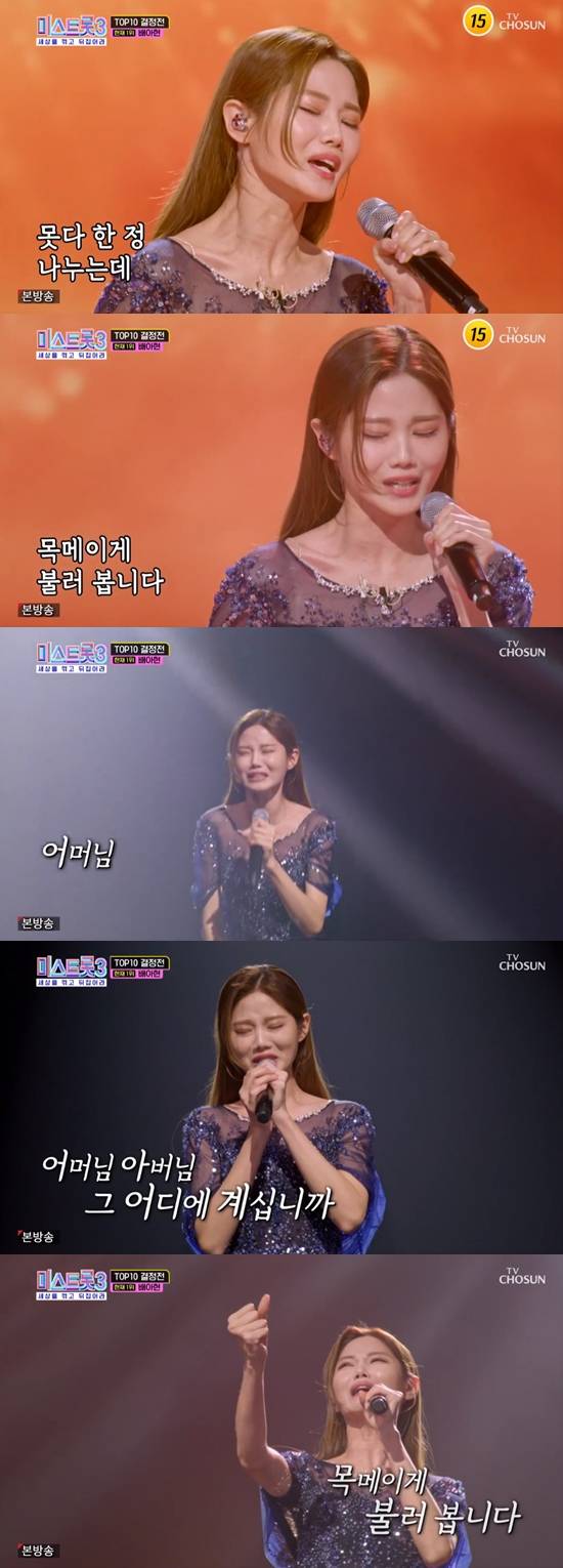 장윤정은 "배아현 씨의 방어전이잖냐. 그러다 보면 힘이 들어가게 돼 있다. 그런데 오히려 이 무대에서 굉장히 절제하더라. 할 줄 아는데 안 하는 게 진짜 무서운 것. 노래로 재벌 되게 생겼다"고 극찬했다.