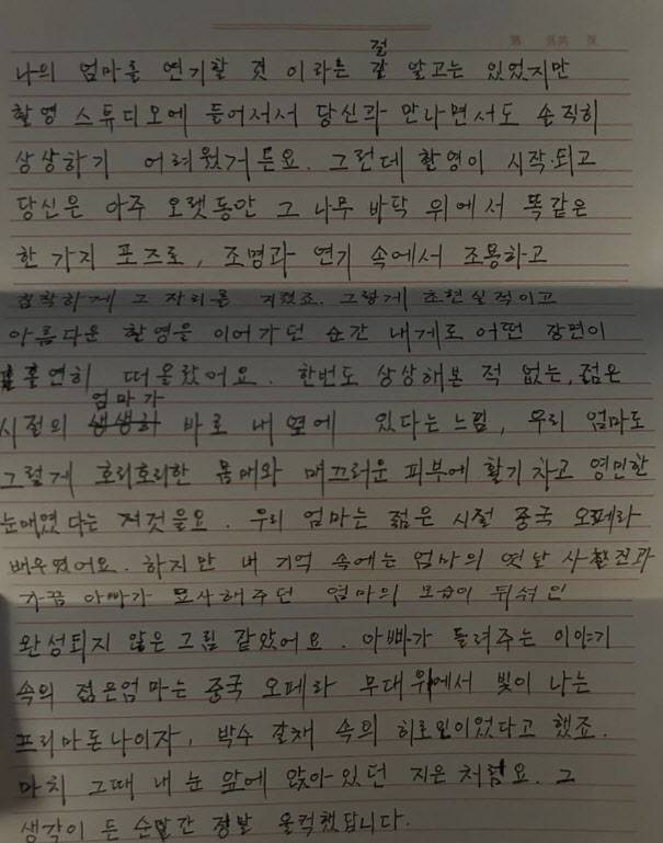 탕웨이는 한글로 쓴 손 편지에서 “지은, 그거 알아요?”라고 운을 뗀 뒤 “촬영하면서 느낀 두 번의 감동적인 순간을 말해주고 싶었다”고 했다.
