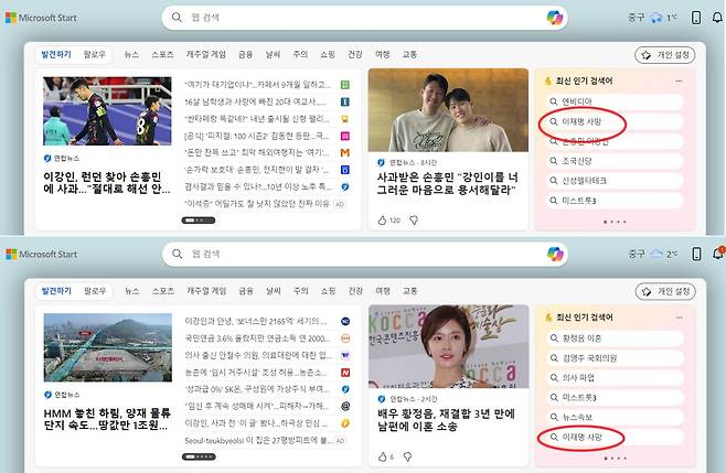 | ▲ 2월 21일(위)과 22일(아래) 마이크로소프트 엣지 첫 화면 '최신 인기 검색어'에 '이재명 사망'이라는 허위검색어가 여전히 노출돼 있다. |