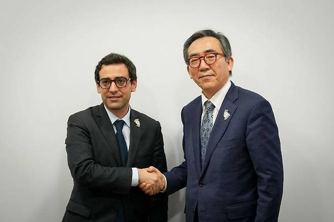 악수하는 조태열 장관과 스테판 세주르네 프랑스 외교장관