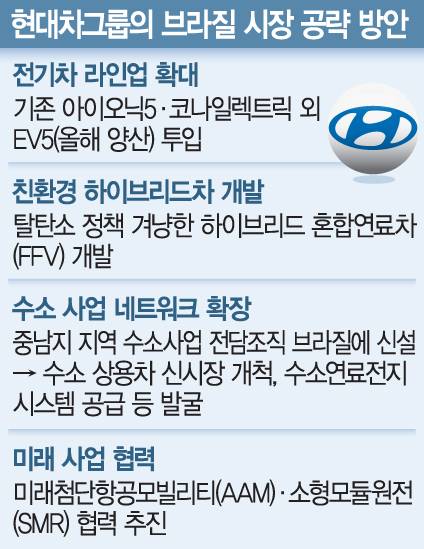 현대차그룹이 남미 최대 경제 대국인 브라질의 자동차 시장을 공략하기 위해 2032년까지 11억 달러(1조 5000억 원)를 투자한다. 브라질은 현대차그룹의 유일한 중남미 생산 거점으로 중남미 시장 공략의 첨병인 현대차 브라질 법인과 중남미 권역본부가 위치해 있다. 현대차그룹은 내연기관 중심인 이곳의 차량 판매를 전기차·수소차 등 친환경 모빌리티로 전환하고 미래항공모빌리티(AAM)·소형모듈원전(SMR) 등 미래 사업도 적극 추진하기로 했다.
